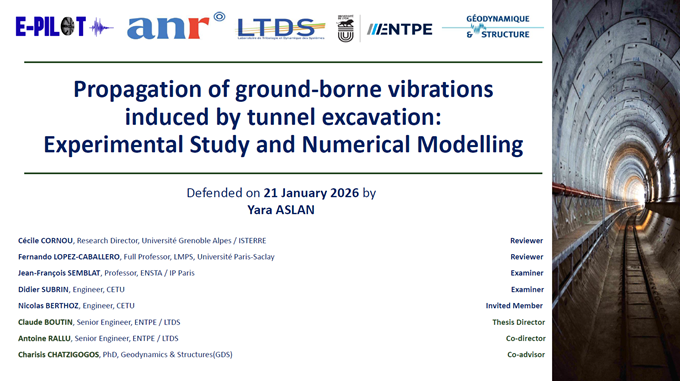 Le mercredi 21 janvier 2026, Yara Aslan a brillamment présenté son travail de doctorat de l’ENTPE intitulé "Propagation des vibrations solidiennes induites par l’excavation de tunnels : étude expérimentale et modélisation".